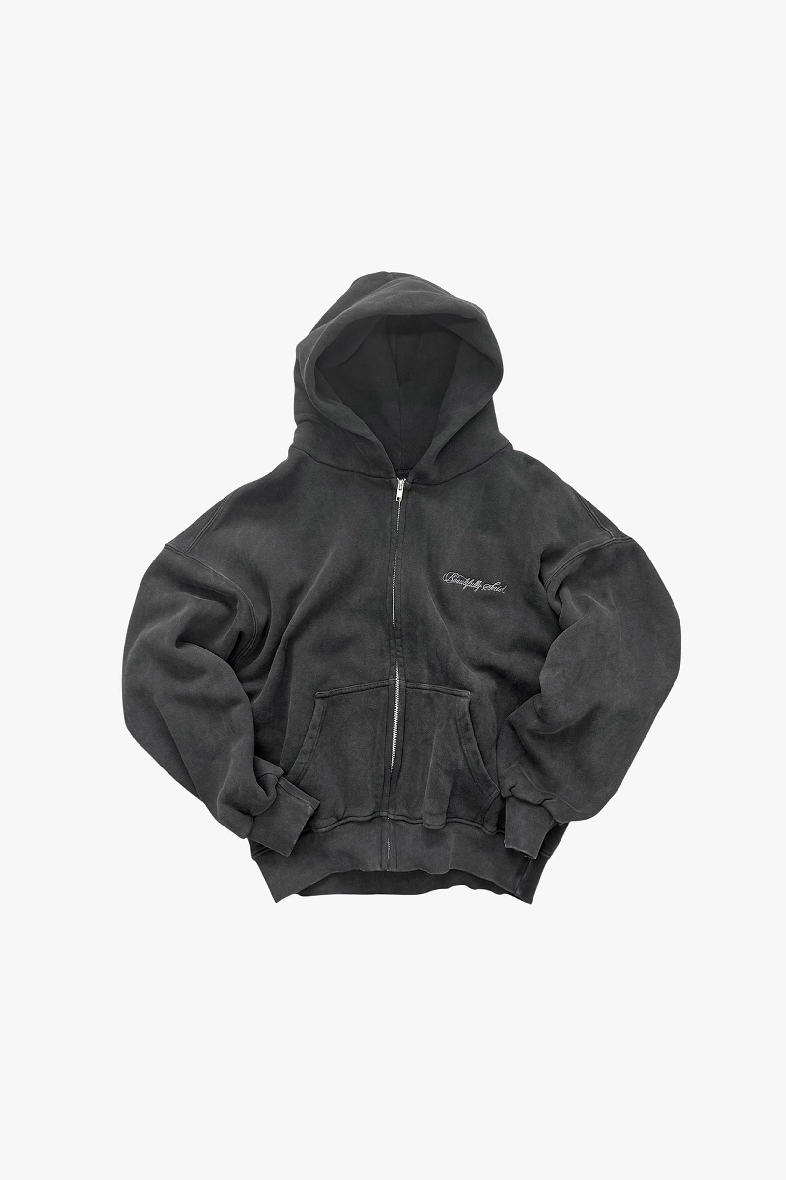 Premium boxy fit zip hoodie in washed black. Made from a ultra heavy weight brushed organic cotton. Garment dyed finish. Ribbed hem & cuffs. Kangaroo pocket. Self-fabric lined hood. Premium YKK zips. Finished with a logo embroidery to the chest